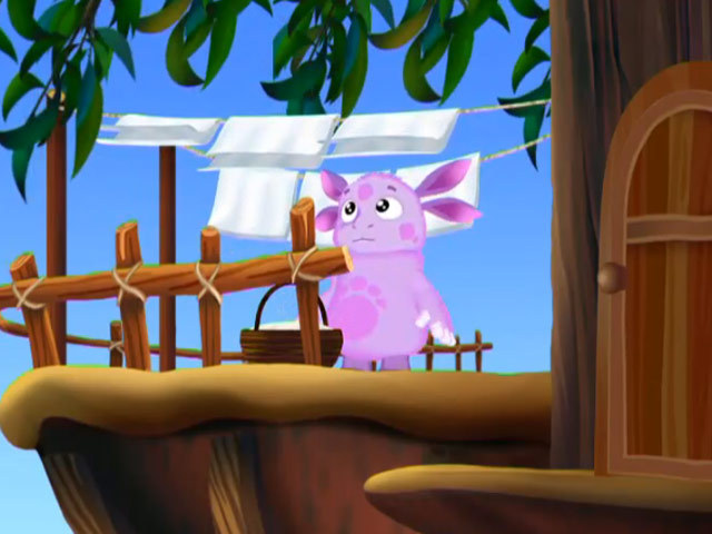 Баба Капа отправилась к сестре и попросила Лунтика выполнитьважное задание: развесить белье на веревке.