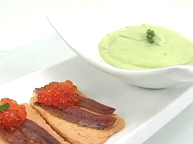 Рецепт соуса из авокадо.Состав:авокадо — 2 штуки;лед — 200 гр;йогурт — 100 гр;сок лимона — 50 гр;анчоусы — 4 кусочка;тосты — 2 кусочка;соль, перец, мята, красная икра.